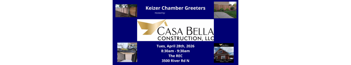 Join us for Keizer Chamber Greeters hosted by Casa Bella Construction at The REC. This is your chance to mingle with fellow local professionals, share what’s new with your business, and build relationships that make our community stronger.